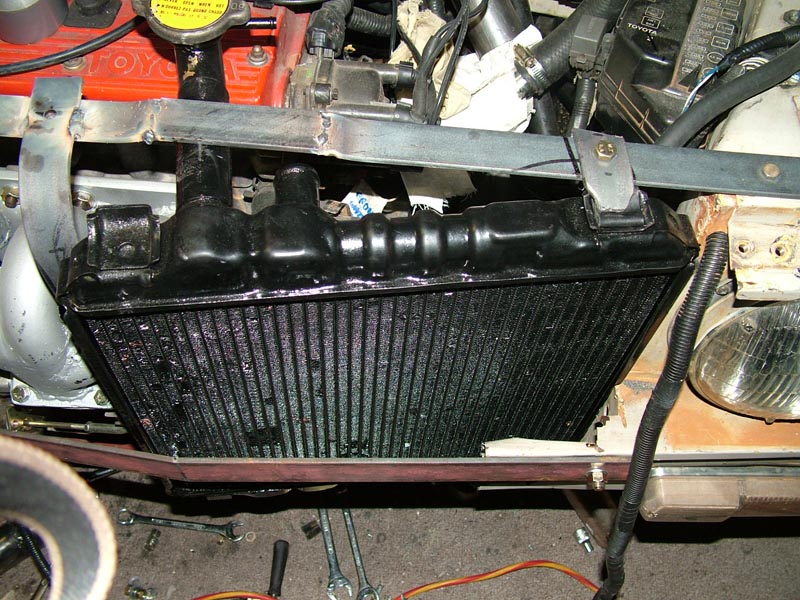 Here is an image of the radiator in place with the grille placed in front. Unfortunately this is with the radiator placed against the headers. Which obviously can't stay that way.