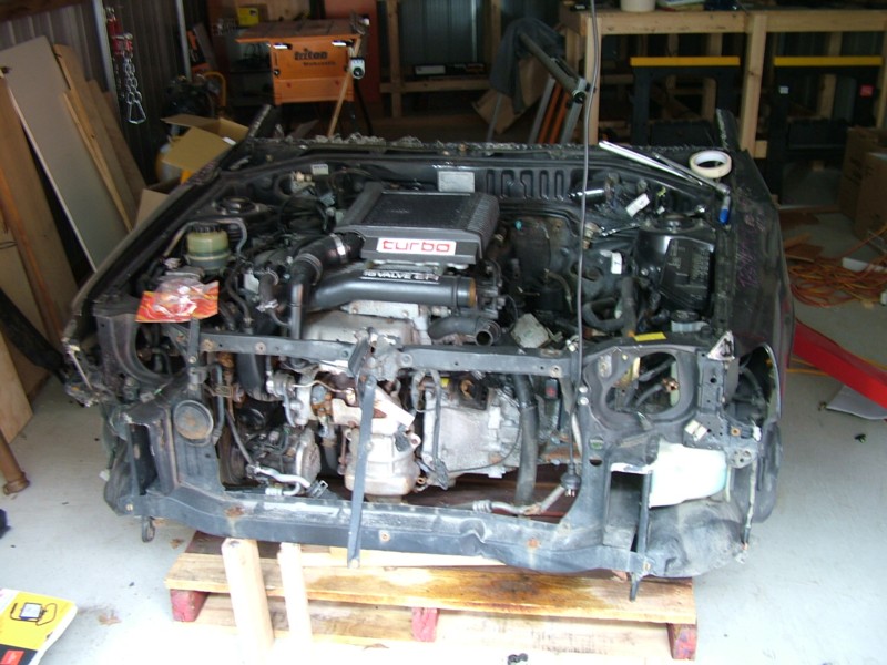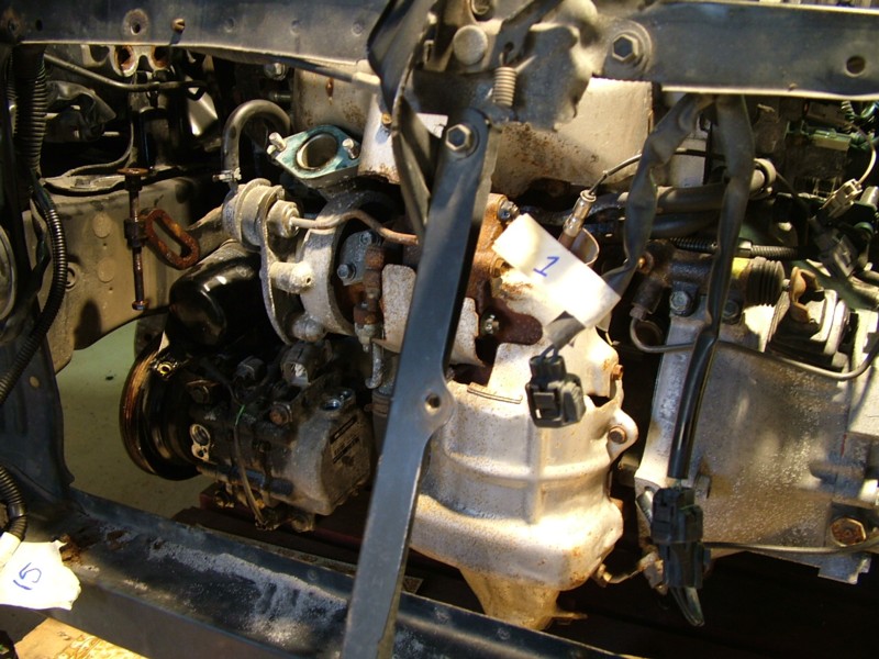 - You have a choice here. Remove headers and turbo or Not. Make sure you disconnect the exhaust from the turbo and the pipe to the EFI system if you so choose. Otherwise you can simply disconnect the exhaust from the base of the turbo and leave in place, to be hoisted out with the engine. This is my choice as you don't have to worry about things going missing and you can do it properly when the engine is out of the car.